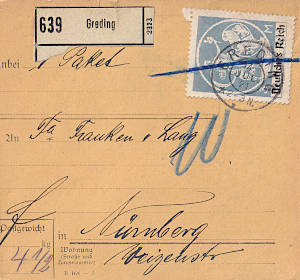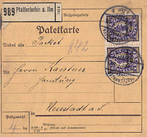 Inlandspaketkarte (9 500 g, > 75 km) vom 03.08.1921 frankiert mit 2 Marken a 4 Mark (=8 Mark) |