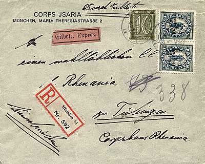 Inlandsbrief mit Einschreiben und Eilzustellung (1-20 g) vom 19.12.1921 frankiert mit 3 Marken (=3,10 Mark, 0,60 Brief 1 Einschreiben 1,50 Eilzustellung)