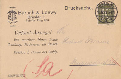 Inland printed matter card from 03.12.1921 franked with 2 stamps a 5 Pfennig(=10 Pfennig)