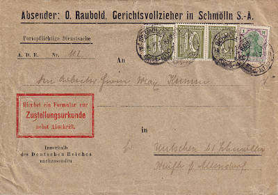 Local cover with affidavit of service (1-20 g) from 25.06.1921 franked with 4 stamps (=1,30 Mark, 0,40 cover 0,50 delivery 0,40 document) |