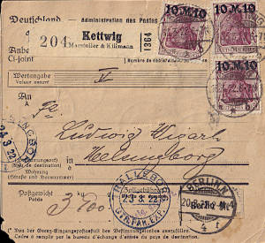 Auslandspaketkarte (3 900 g) vom 23.03.1922 frankiert mit 7 Marken a 10 Mark (=70 Mark)