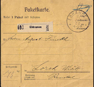 Inlandspaketkarte (3 500 g, < 75 km) vom 12.01.1922 frankiert mit 10 Marken a 60 Pfennig (=6 Mark) |