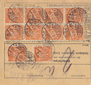 Inlandspaketkarte (2 500 g, > 75 km) vom 23.05.1922 frankiert mit 12 Marken a 75 Pfennig (=9 Mark) |