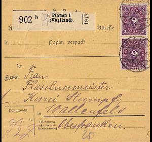 Inlandspaketkarte (2 000 g, < 75 km) vom 08.06.1922 frankiert mit 2 Marken a 3 Mark auf 1¼ Mark (=6 Mark) |