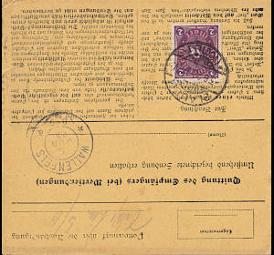 Inlandspaketkarte (3 500 g, < 75 km) vom 03.06.1922 frankiert mit 3 Marken a 2 Mark (=6 Mark) |