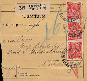 Inlandspaketkarte (3 500 g, > 75 km) vom 07.03.1922 frankiert mit 6 Marken a 1½ Mark (=9 Mark) |