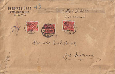 Inlandsbrief mit Wertangabe (2 000 Mark) (154 g) vom 04.05.1922 frankiert mit 3 Marken a 3 Mark (=9 Mark, 4 Brief 2 Einschreiben 3 Wert) |