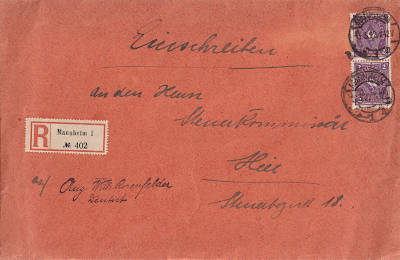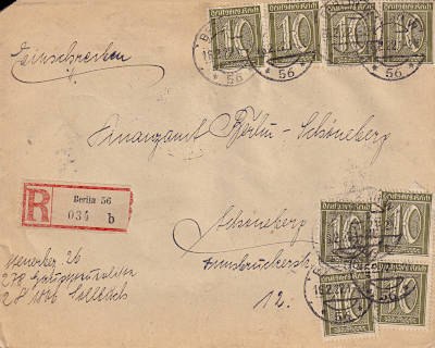 Local cover with registeration (21-250 g) from 16.02.1922 franked with 40 stamps a 10 Pfennig (=4 Mark, 2 cover 2 registeration)