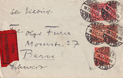 Foreign cover with special delivery (1-20 g) from 18.07.1922 franked with 3 stamps (=18 Mark, 6 cover 12 special delivery) |