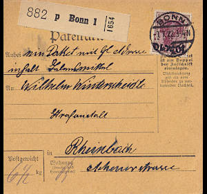 Inlandspaketkarte (4 500 g, > 75 km) vom 04.09.1922 frankiert mit 14 Marken a 1 Mark (=14 Mark) |