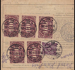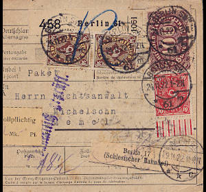 Auslandspaketkarte (18 500 g, > 75 km) vom 24.11.1922 frankiert mit 10 Marken (=672 Mark)