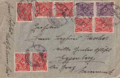 Foreign cover (1-20 g) from 04.01.1923 franked with 9 stamps (=25 Mark)