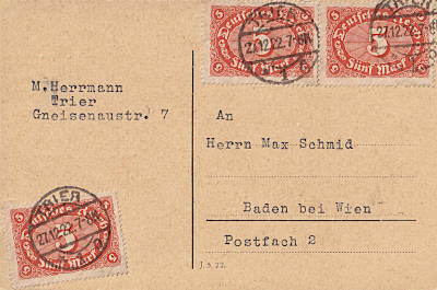 Foreign postcard from 27.12.1922 franked with 3 stamps a 5 Mark (=15 Mark)