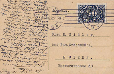 Auslandspostkarte vom 31.12.1922 frankiert mit einer Marke a 50 Mark (=50 Mark)