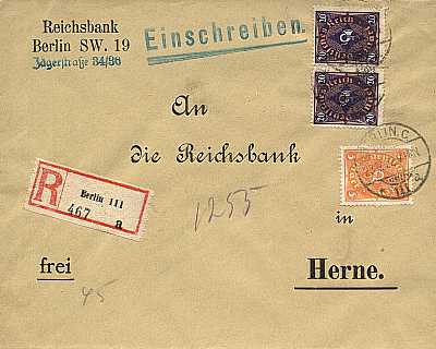Inland cover with registeration (1-20 g) from 23.12.1922 franked with 3 stamps (=45 Mark, 25 cover 20 registeration)