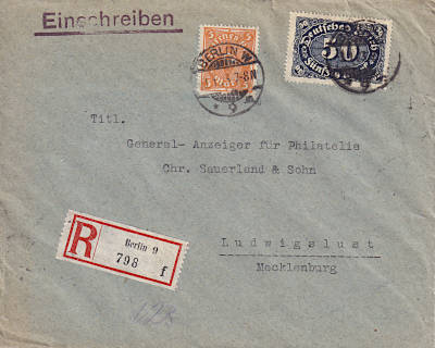 Inland cover with registeration (21-100 g) from 03.01.1923 franked with 2 stamps (=55 Mark, 35 cover 20 registeration)
