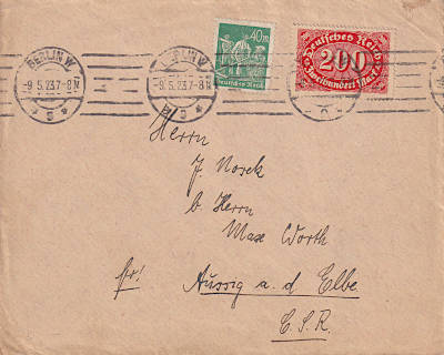 Auslandsbrief (1-20 g) vom 09.05.1923 frankiert mit 2 Marken (=240 Mark)