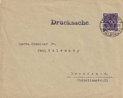 Inlandsdrucksache (1-25 g) vom 17.04.1923 frankiert mit einer Marke a 20 Mark (=20 Mark) |