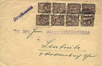 Inlandsdrucksache (26-50 g) vom 03.03.1923 frankiert mit 8 Marken a 5 Mark (=40 Mark) |