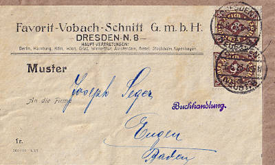 Inlandsbücherzettel (1-25 g) vom 17.06.1923 frankiert mit 4 Marken a 5 Mark (=20 Mark) |