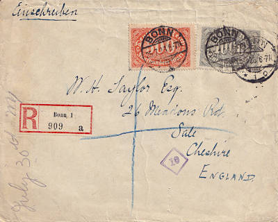 Auslandsbrief mit Einschreiben (21-40 g) vom 25.07.1923 frankiert mit 2 Marken (=1 500 Mark, 1 200 Brief 300 Einschreiben) |