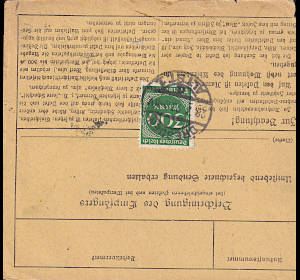 Inland parcel card (3 000 g, >75 km) from 28.07.1923 franked with 3 stamps (=1 600 Mark) |