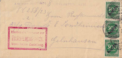 Inland cover with affidavit of service (1-20 g) from 21.07.1923 franked with 3 stamps a 300 Mark (=900 Mark, 300 cover 300 delivery 300 document)
