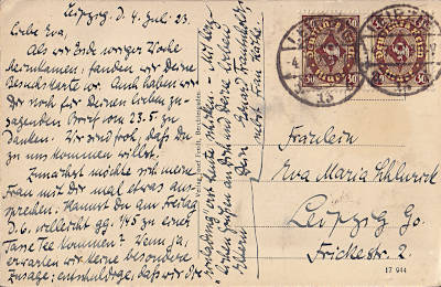 Local postcard from 04.07.1923 franked with 2 stamps a 30 Mark (=60 Mark)