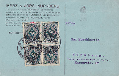Local postcard from 23.08.1923 franked with 4 stamps a 50 Mark (=200 Mark)