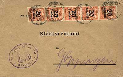 Inlandsbrief (21-100 g) vom 12.09.1923 frankiert mit 5 Marken a 20 000 Mark auf 30 Pfennig (=100 000 Mark)