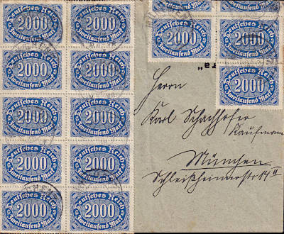 Local cover (1-20 g) from 06.09.1923 franked with 15 stamps a 2 000 Mark (=30 000 Mark) |