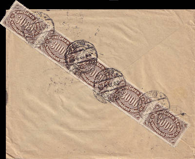 Local cover (251-500 g) from 06.09.1923 franked with 30 stamps a 3 000 Mark (=90 000 Mark) |