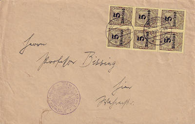 Local cover (1-20 g) from 17.09.1923 franked with 6 stamps a 5 000 Mark on 5 Mark (=30 000 Mark) |