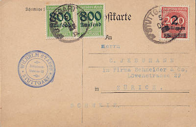 Foreign postcard from 05.10.1923 franked with 3 stamps (=3,6 Million Mark)
