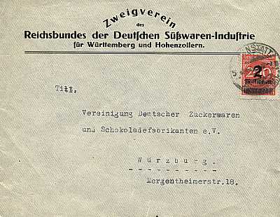 Inlandsbrief (1-20 g) vom 03.10.1923 frankiert mit 8 Marken a 250 000 Mark auf 10 Pfennig (=2 Millionen Mark) |