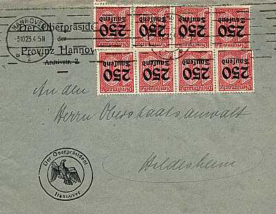 Inlandsbrief (1-20 g) vom 05.10.1923 frankiert mit 8 Marken a 250 000 Mark auf 200 Mark (=2 Millionen Mark) |