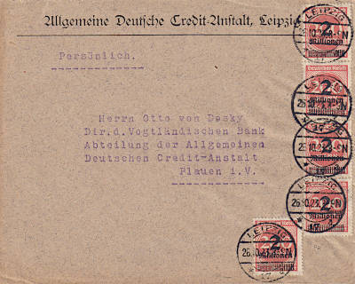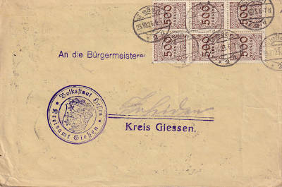 Inland cover (1-20 g) from 25.10.1923 franked with 5 stamps a 2 Million Mark on 200 Mark (=10 Million Mark) |