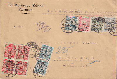 Inlandsbrief mit Wertangabe (400 Millionen Mark) (47 g) vom 03.11.1923 frankiert mit 10 Marken (=198 Millionen Mark, 140 Millionen Brief 50 Millionen Einschreiben 8 Millionen Wert)