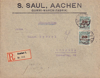Inland cover with registeration (1-20 g) from 22.11.1923 franked with 2 stamps a 20 Billion Mark (=40 Billion Mark, 20 Billion cover 20 Billion registeration)