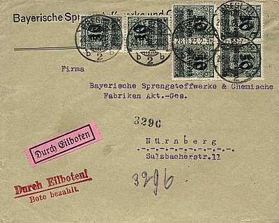 Inlandsbrief mit Eilzustellung (1-20 g) vom 28.11.1923 frankiert mit 6 Marken a 10 Milliarden Mark auf 50 Millionen Mark