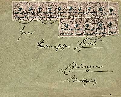 Inlandsdrucksache (1-50 g) vom 07.12.1923 frankiert mit 15 Marken a 2 Milliarden Mark (=30 Milliarden Mark)