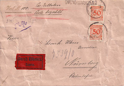 Inland cover with value (100 Mark) and special delivery (52 g) from 28.03.1924 franked with 2 stamps a 50 Pfennig (=1 Mark, 0,20 cover 0,30 registeration 0,20 value 0,30 special delivery)