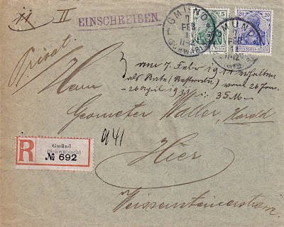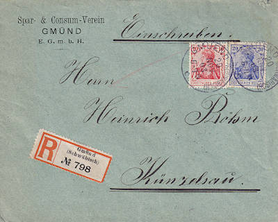 Ortsbrief mit Einschreiben (1-250 g) vom 07.02.1911 (1. Periode) frankiert mit 2 Marken (=25 Pfennig, 5 Brief 20 Einschreiben) |