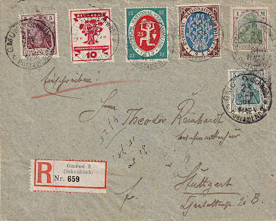 Inlandsbrief mit Einschreiben (1-20 g) vom 09.11.1922 (9. Periode) frankiert mit 3 Marken (=10 Mark, 6 Brief 4 Einschreiben) |