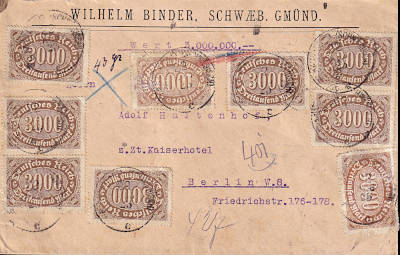 Inlandsbrief mit Wertangabe (3 Millionen Mark) (43 g) vom 22.08.1923 (15. Periode) frankiert mit 17 Marken (=32 200 Mark, 1 200 Brief 1 000 Einschreiben 30 000 Wert) |