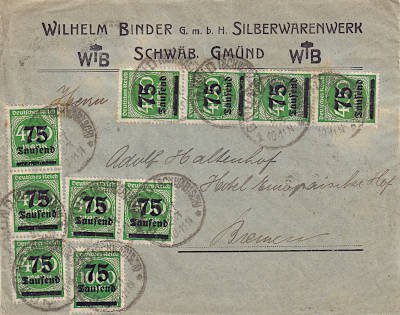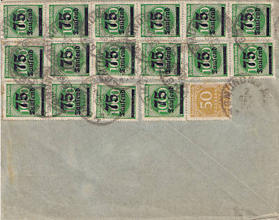 Inlandsbrief (1-20 g) vom 12.09.1923 (17. Periode) frankiert mit 15 Marken a 5 000 Mark (=75 000 Mark) |