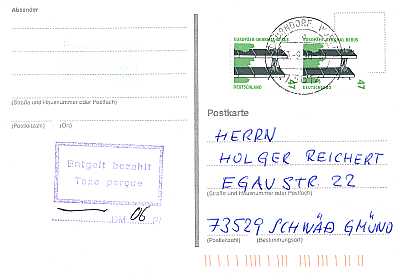 Schorndorf (Württemberg): Inlandspost- karte vom 23.09.1999 mit violettem Recht-eckstempel mit Zeile (3z) "Gebühr bezahlt/ Taxe perçue/ DM Pf" und handschriftliche Gebührenhöhe "06" |