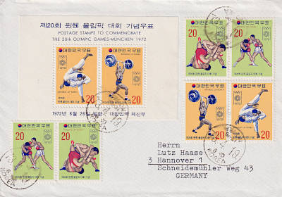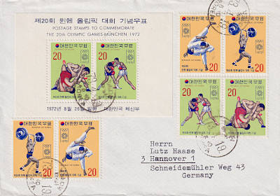 Foreign cover franked with 6 stamps and one souvenir sheet Summer Olympic Games Munich