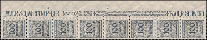 Reklameleiste: kommerzielle Werbung auf einem Bogenrand um die angrenzenden besonders stark beanspruchten Briefmarkenklischees beim Druck vor Abnutzungen und Beschädigung zu schützen |