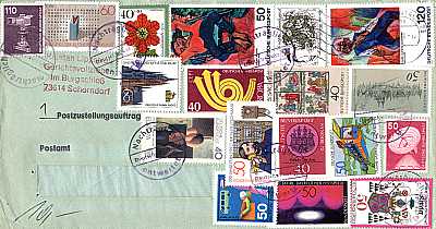 Massenfrankatur: Postsendung frankiert mit einer Vielzahl von Briefmarken infolge Fehlens geeigneter hoher Wertstufen oder als philatelistische Spielerei |
